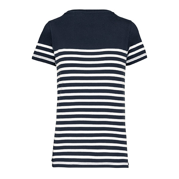 Coton peigné : durabilité du vêtement dans le temps Lavage aux enzymes : Matière douce et confortable. 100% coton. Ce t-shirt est conçu à partir de 100% de coton peigné biologique. Le certificat GOTS est délivré par Ecocert Greenlife. Coupe droite. Lavage aux enzymes. Encolure ronde avec bord-côte 1x1. Rayures tricotées. Bande de propreté au col. Finition double aiguille bas de manches et bas de vêtement.